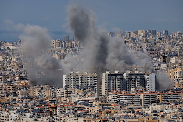 Smoke billows after reported strikes on Beirut's southern suburbs, as seen from Baabda, Lebanon.Mohamed Azakir/Reuters