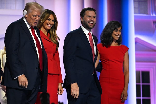 From the left: Former U.S. President Donald Trump, Melania Trump, U.S. Senator and 2024 Republican vice presidential candidate J.D. Vance and his wife Usha Vance stand onstage during the last day of the 2024 Republican National Convention on July 18.JIM WATSON/Getty Images
