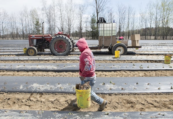 A temporary foreign worker from Mexico works on a berry farm in Mirabel, Que., May 6, 2020. A Globe and Mail analysis of figures recently published by Employment and Social Development Canada show that employer demand for temporary foreign labour is soaring at a time of near-record-low unemployment rates and elevated job vacancies.Graham Hughes/The Canadian Press