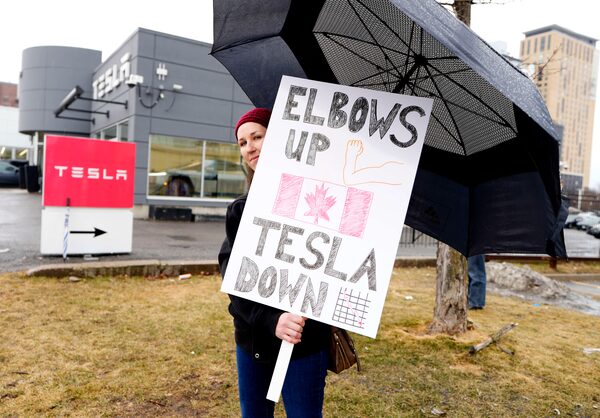 People attend a protest rally outside a Telsa dealership in Ottawa against CEO Elon Musk's political influence on March 22.Justin Tang/The Canadian Press