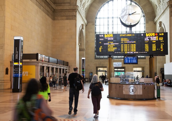 Passengers at the Union Station concourse on May 22 at the station’s Great Hall in Toronto. In 2019, five million people rode a Via train, before the pandemic halted most travel in 2020, when ridership fell to 1.1 million.Abhijit Alka Anil/The Globe and Mail