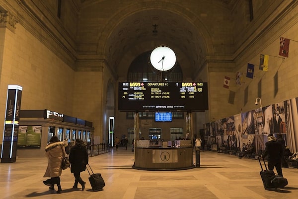 People make their way through Union Station in Toronto as the departure display for Via Rail show all trains have been cancelled on February 13, 2020.The Canadian Press