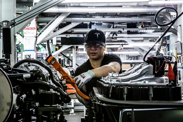 A worker on the Model 3 assembly line where the marriage of the battery and car takes place at the Tesla factory in Fremont, Calif.CHRISTIE HEMM KLOK/The New York Times News Service