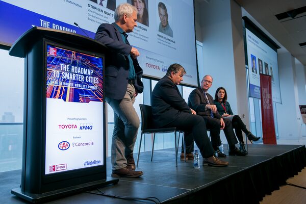 Globe Drive automotive journalist Mark Richardson moderates a discussion on integrating mobile technology into society at the Smart Cities conference on urban mobility in Toronto at The Globe and Mail Centre on Feb. 12. From left, Peter Hatges of KPMG Canada, Stephen Beatty of Toyota Canada and Andrea Brown of Ontario Power Generation.Glenn Lowson