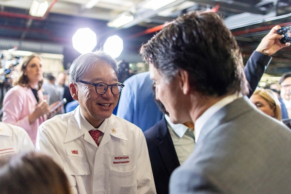 Honda CEO Toshihiro Mibe shakes hands with Prime Minister Justin Trudeau after Honda announced plans to build electric vehicles and their parts in Ontario with financial support from the Canadian and provincial governments, at the company's automotive assembly plant in Alliston, Ont. on April 25.Carlos Osorio/Reuters