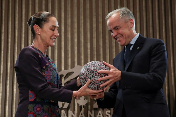 Sheinbaum gifts Prime Minister Mark Carney a soccer ball at the G7 Leader's Summit in June. Canada and Mexico have handled U.S. tariffs in very different ways.Amber Bracken/Reuters