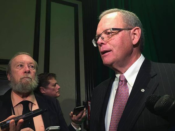 Sanford Riley, former board chair at Manitoba Hydro, speaks to reporters after a speech to business leaders in Winnipeg on Dec. 1, 2017. Mr. Riley is facing allegations of sexual harassment, according to a lawsuit.The Globe and Mail