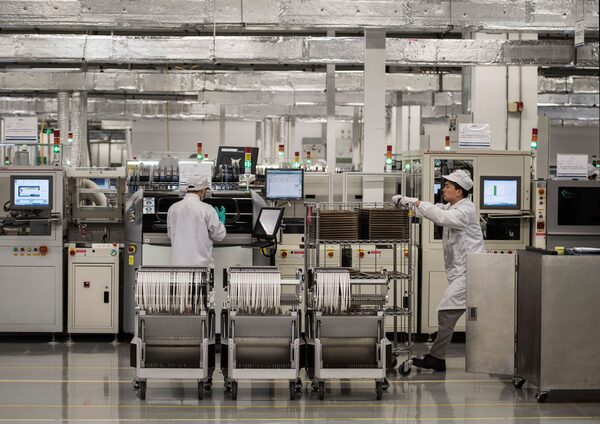 Workers on the production line at Huawei's production campus in Dongguan, near Shenzhen, China, on April 11, 2019. Observers expect there will be pressure on the Canadian government to announce a decision on a Huawei 5G ban now, with the return of Michael Kovrig and Michael Spavor to Canada.Kevin Frayer/Getty Images