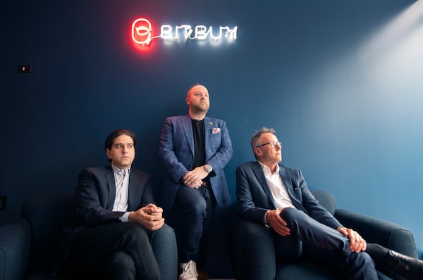 From left, WonderFi CEO Dean Skurka, CoinSmart CEO Justin Hartzman and Coinsquare CEO Martin Piszel on April 3.Fred Lum/The Globe and Mail