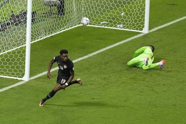 Canada's Alphonso Davies scores his side's opening goal during the World Cup group F soccer match between Croatia and Canada, at the Khalifa International Stadium in Doha, Qatar, on Nov. 27.The Canadian Press