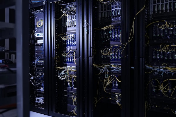 Xanadu's latest quantum machine, Aurora, sits on four server racks with its components networked together using optical fibres.Supplied