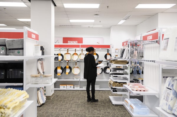 Behind them, housewares, furniture, kids’ toys and clothing, pet supplies and apparel are displayed on white metal shelves under familiar red-and-white signage. A $99 storage bench is displayed alongside $15 sage and moss scented candles; the kitchen area stocks blush-pink toasters, dish sets and acacia serving boards; and the children’s section displays toys, tiny outfits and sippy cups. The majority of the products are designed in-house under Zellers’s new private label, Anko, though the store will also sell some name-brand products, such as from Disney DIS-N and Mattel MAT-Q.