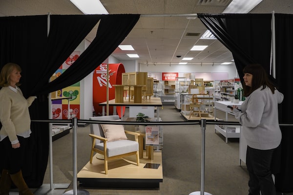 Shelley Tangney, Zellers VP of marketing, and Hudson's Bay Company’s Tiffany Bourré, pull back the curtain of the Zellers prototype store. HBC is hoping the Zellers reboot will draw in customers who might not otherwise visit Bay stores, especially price-sensitive Canadians looking for relief amid inflation.Christopher Katsarov/The Globe and Mail