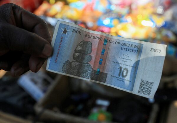 A vendor shows a ten Zimbabwe gold-backed (ZiG) note along a street in Harare, Zimbabwe, on July 17.Philimon Bulawayo/Reuters
