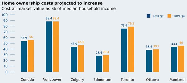 “The bar to home ownership is higher than ever in Vancouver and Toronto, where a typical household would need to spend a record 88 per cent and 76 per cent of its income, respectively, to pay the mortgage, property taxes and utilities for a home purchased today,” its economists said.