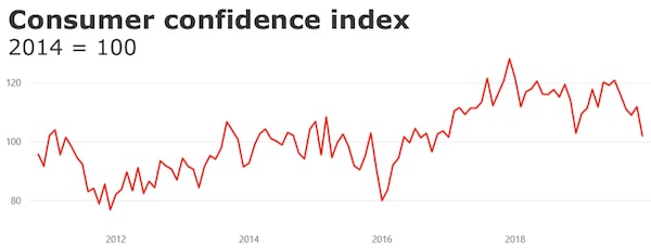 On the blue side, The Conference Board of Canada said its consumer confidence index now sits at a three-year low.