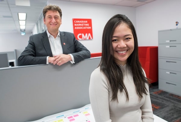 Christine Ung and John Wiltshire, President of the Canadian Marketing Association, are photographed at the CMA office on June 18, 2019. CMA plans to test its online program this fall at half a dozen college and university campuses before a full roll-out next year.Fred Lum