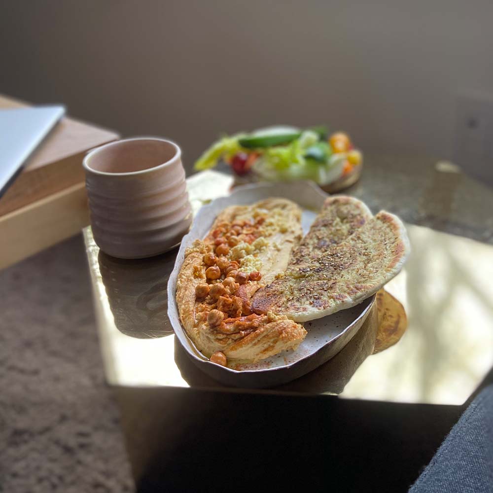 “This is a favourite healthy snack of ours at home, and our son, Barlow, loves it too. The hummus itself is part of a recipe I developed for one of Flock’s most popular salads. It’s easy to make. The quick version is just adding roasted or steamed sweet potato to your hummus and blending it with extra lemon and tahini for added zip. It lasts in the refrigerator for up to a week and pairs well as a side under a roasted piece of chicken or grilled vegetables. We like to eat our hummus with flatbread – it’s essentially flattened pizza dough brushed with za’atar and olive oil and grilled in a cast-iron pan. If you want to take it a step further, garnish with roasted chickpeas, crumbled feta cheese and smoked paprika.”
