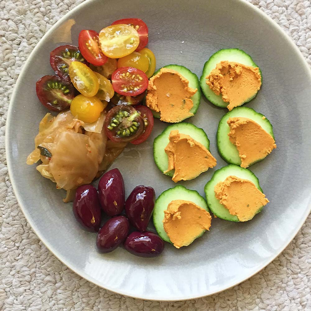 “When I’m snacking while I work, my head is usually deep in thought, and I don’t want to get distracted by my snack. This platter has a variety of flavours and textures and is the perfect snack as it’s easy to make, it can hang out on my desk at room temperature and I can eat from it with my hands, which is my most favourite thing to do. I like to use my snacking to clear out the little bits of things I have kicking around in the fridge, so the selection changes daily. There are lots of ways to substitute other things in, depending on what you like and what you’ve got on hand. For this plate, I’m snacking on sliced cucumbers topped with pimento cheese, kalamata olives, sliced cherry tomatoes and kimchi. Some whole walnuts or almonds would be a nice thing to add in too!”