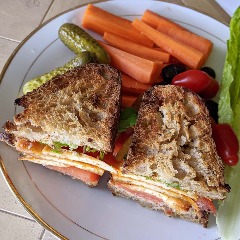 “I’ve been really fortunate to be able to purchase a weekly Good Food Box of fresh produce and bread from FoodShare Toronto, a local food-justice organization that I work at. My morning breakfast snack was inspired by the contents of my Good Food Box this week, with the addition of tofu and some condiments. I’ve made an oven-roasted tofu sandwich on sourdough bread with living pea shoots. The tofu was marinated in some Frank’s Hot Sauce, olive oil, smoked paprika and salt and pepper. I roasted it for 20 minutes and then flipped them over and roasted it for another 20 minutes, all at 400 degrees. Assemble the sandwich with a dollop of mayo, the tofu, the shoots and some slices of tomato. I like my sandwiches with pickles and carrot sticks on the side for some added crunch.”