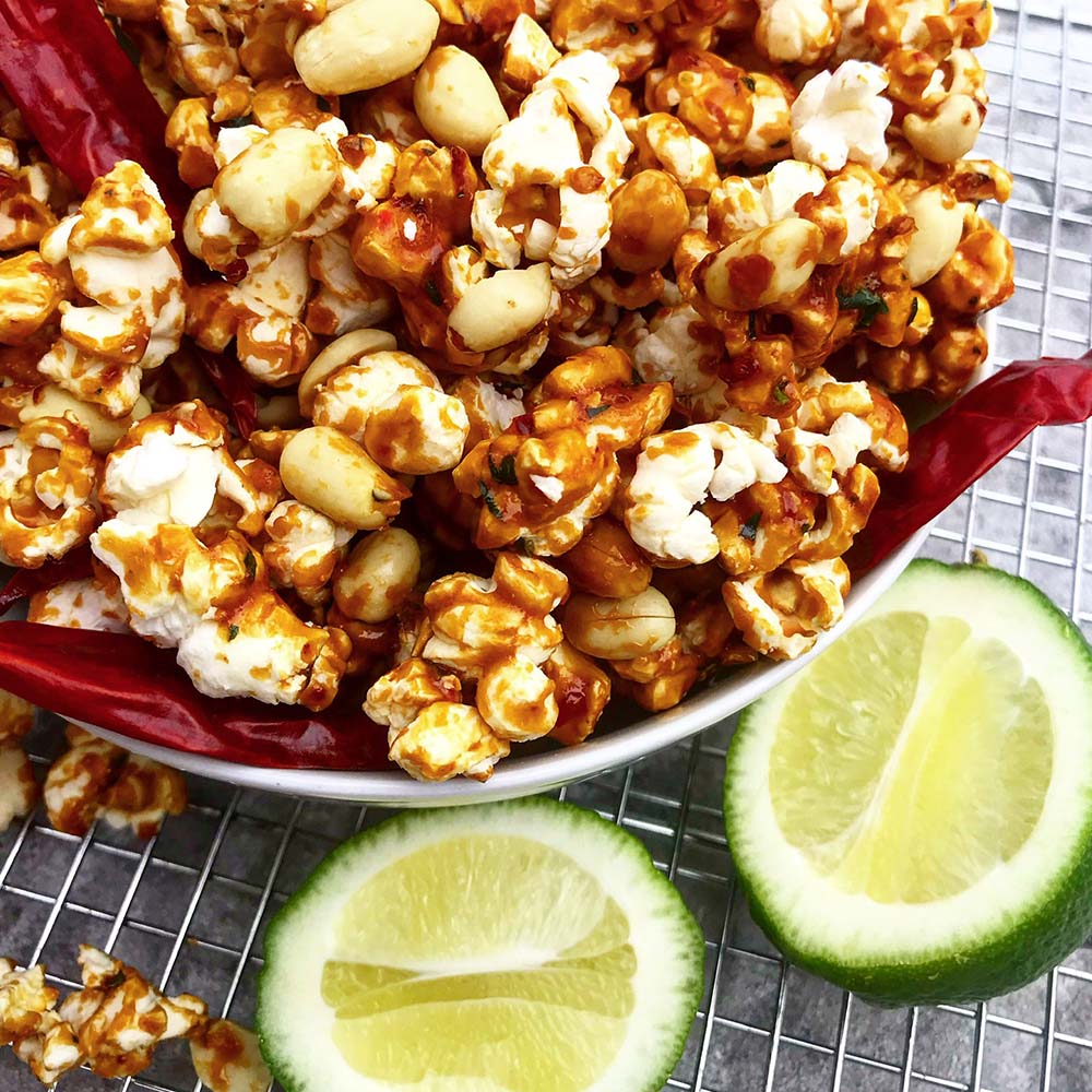 “The best snack for me when working from home is one that keeps me on my toes! I love vibrant flavours and interesting textures, which is why my homemade pad thai popcorn is always a go-to. This variation on caramel corn is super easy to make and will instantly transport you to the streets of Bangkok. I make a quick caramel by melting together ½ cup packed brown sugar, ¼ cup corn syrup and 1 tsp vegetable oil and cook it for five minutes until thickened and bubbly. I then flavour the caramel with some fish sauce, lime juice and sambal oelek (Indonesian chili sauce) and fold it into about 14 cups of freshly popped popcorn with dry red chillies, kaffir lime leaves and a generous scoop of roasted peanuts. The result is an addictive snack that is crunchy, crispy, sweet, spicy, savoury and tangy all at once. It’ll last in an air-tight container for up to a month.”