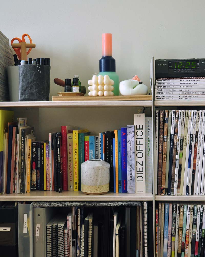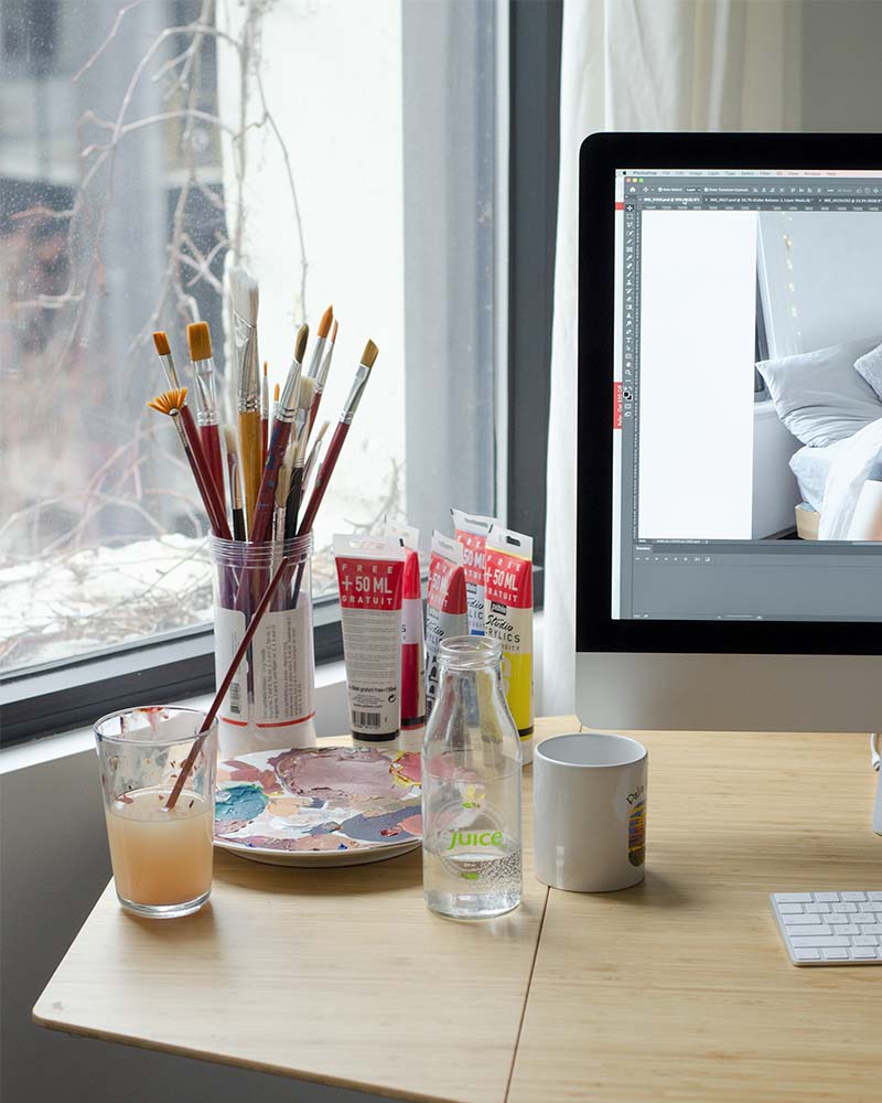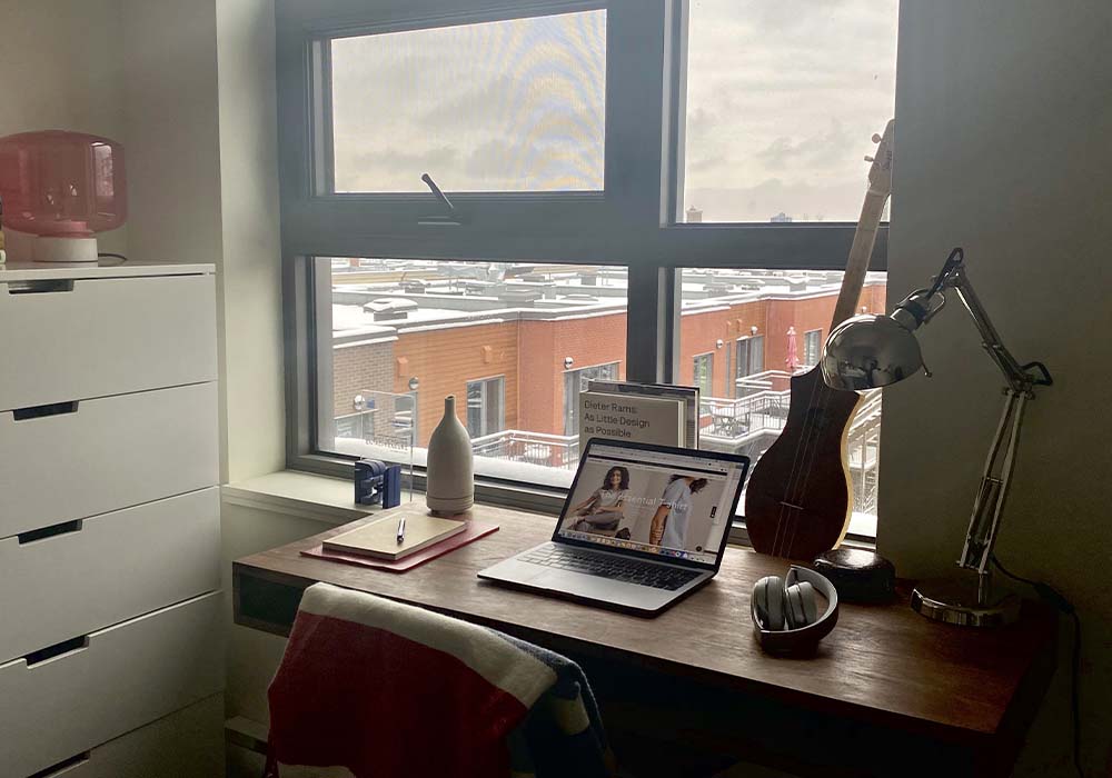 “I live in a home with two roommates, so I set up shop in my bedroom as I thought it was the most conducive space to productivity and uninterrupted focus. I was able to bring home some drawing tools and a large monitor from the office. It’s been nice to be in my own curated space surrounded by my books and favourite objects. My tip for working at home is to streamline your notifications into one device. This helps prevent a surround sound orchestra of alerts.”
