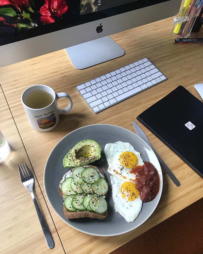“On Day 6 of isolation, I decided to rearrange my entire apartment and hid my bed around a dark corner, leaving loads of room for my new office/painting studio/yoga room. I now have all the space I need to stay focused, feel creative and to learn all the ridiculous TikTok dances my friends are challenging me to do. One hot WFH tip I have that helps me start my day happy is to make a hot breakfast every morning – a tiny luxury that you can’t have at the office.”