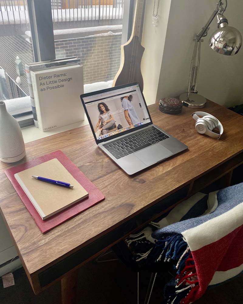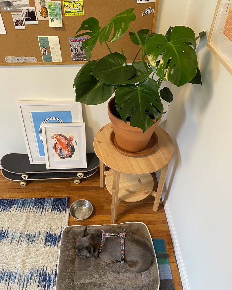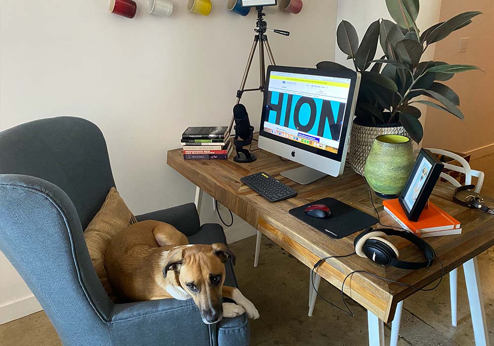 “Like my dog, Olive, I find it helpful to move around throughout the day for a change of scenery. Now that I’m working from home more, I’m planning to hang more prints and surround myself with plants (to act as my co-workers). My work-from-home tip is to try and stick to the same routine you had when you were going into the office. This also helps to differentiate between weekdays and weekends.”