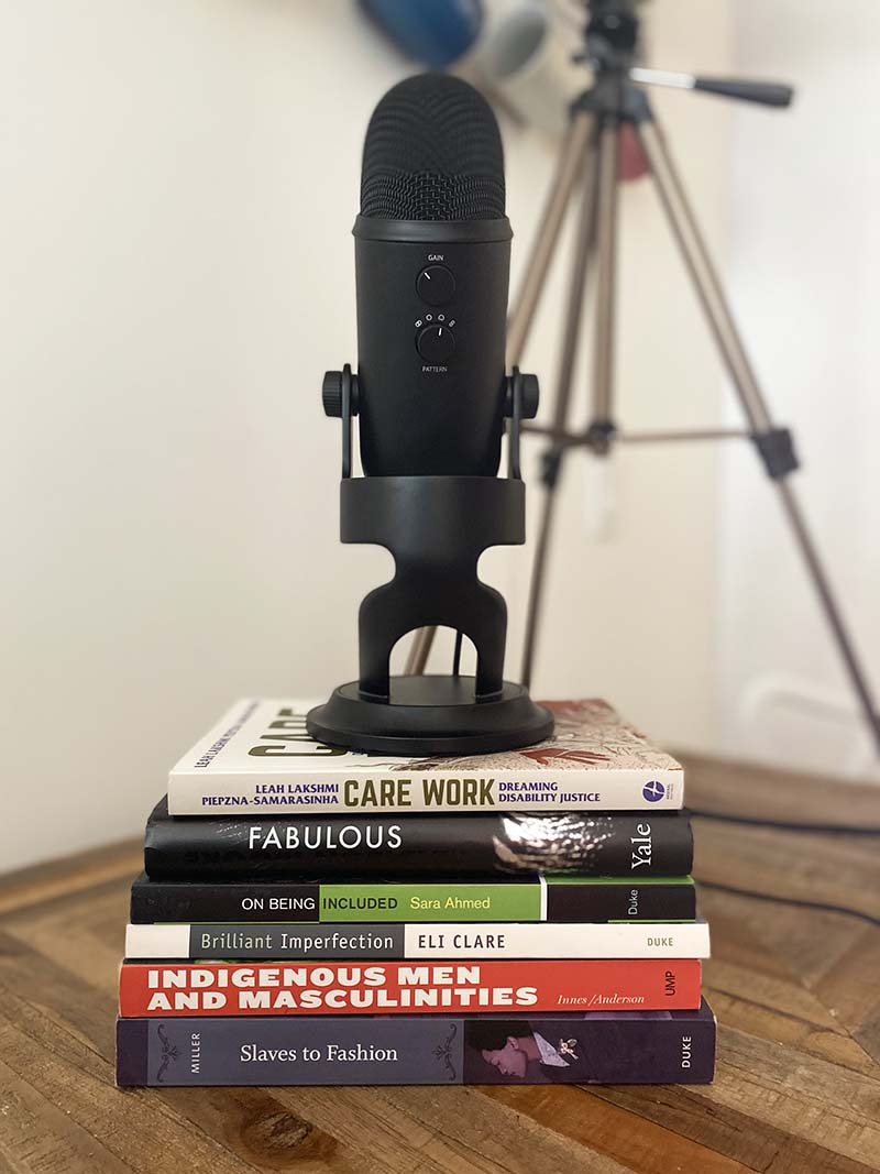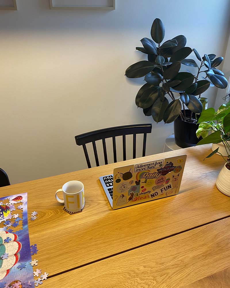 “I’ve turned our kitchen table into the temporary office desk for myself and my husband. I’ve also set up a mic and fill light here for online meetings and lectures. I made my favourite chair in our home my new desk chair. It also happens to be our dog Apple’s favourite, so we end up sharing it most of the time. If you live in a smaller space and are sharing a desk with a partner, my tip is to schedule work and meetings for the week together. You can then plan out who needs to use the desk and who can work from the couch.”