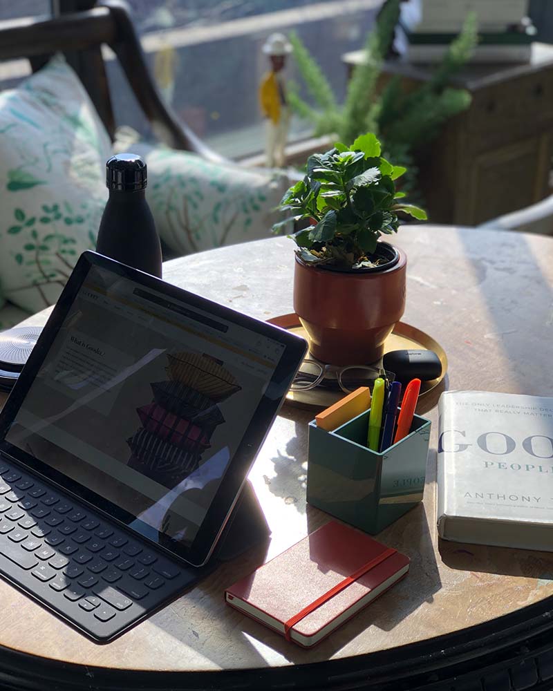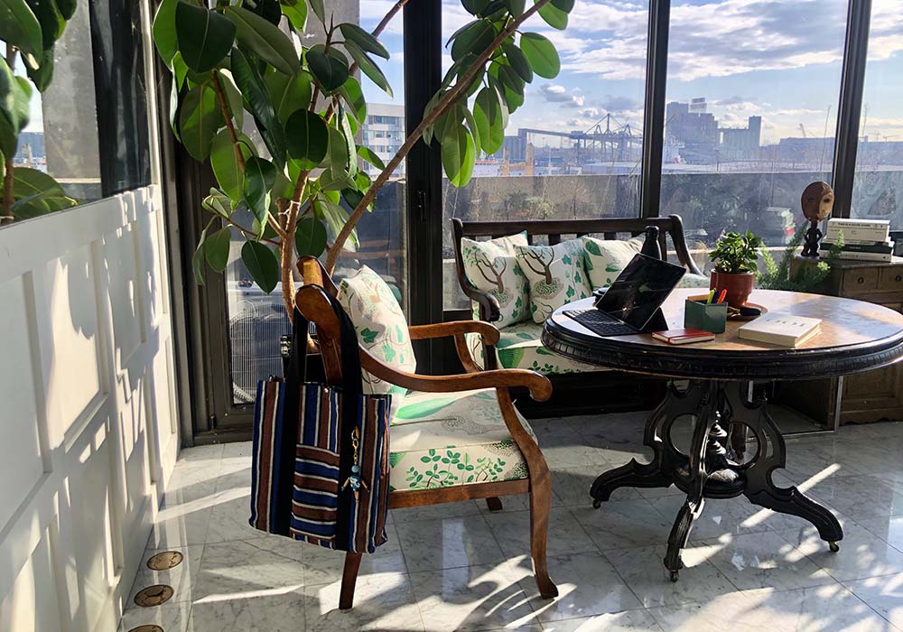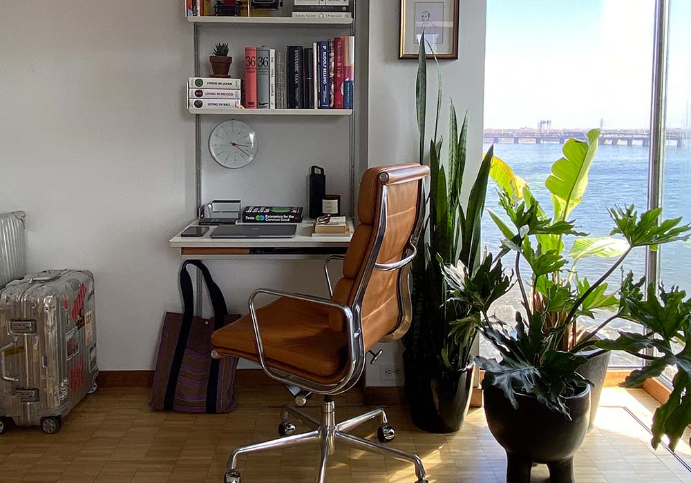 “As entrepreneurs, home has always been a place of work and leisure for my wife and I, so this transition has been rather seamless. Our solarium was designed as our mindful sanctuary, with an eclectic mix of Scandinavian textile, antique furniture, tropical plants and various art pieces from our travels – that is until our daughters reappropriated it as an arts-and-crafts/slime playroom. It’s been a welcome change to now have the space return closer to its original function – and cleanliness. As spring approaches, I am excited to watch the outdoor plants come back to life and add more beauty to my new work environment.”