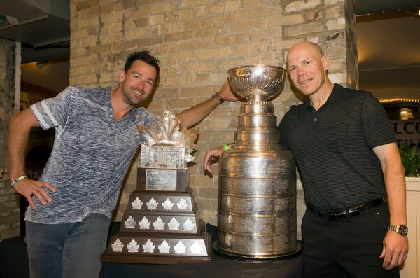 Stanley Cup and Conn Smythe Trophy winner Justin Williams, left, celebrates his hockey success with his agent Thane Campbell of PCI Hockey.