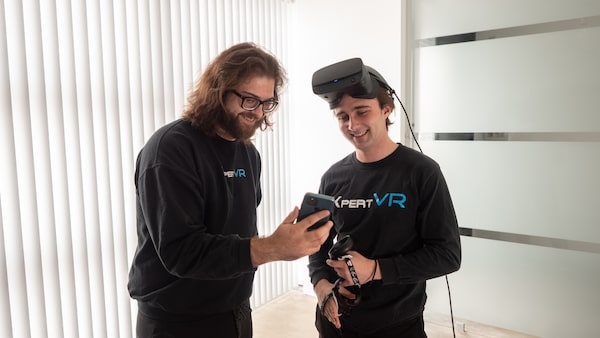 XpertVR Co-founders Drew MacNeil and Evan Sitler test out new virtual reality equipment and simulations.HANDOUT