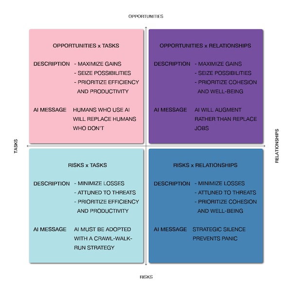 Here is a framework that describes leaders along two psychological characteristics, explaining the reasons behind their AI messages, the unanticipated costs and what leaders should do instead.