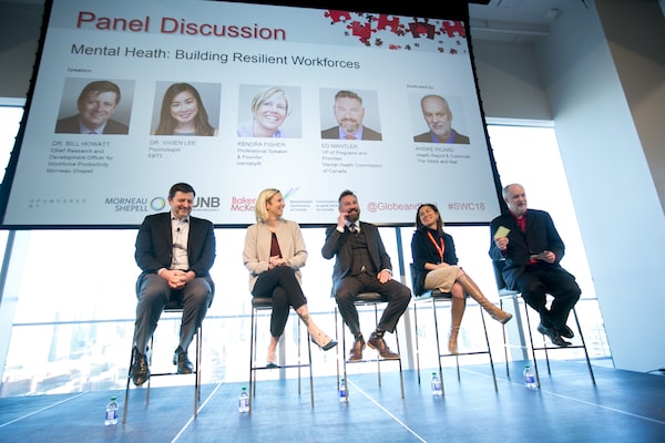 Bill Howatt, chief research and development officer of workforce productivity at Morneau Shepell, Kendra Fisher, founder of mentallyfit, Ed Mantler, vice president of programs and priorities with the Mental Health Commission of Canada, and Vivien Lee, a psychologist with EBT3, moderated by Globe Health reporter Andre Picard, discuss mental health at work and how you help build a resilient workforce at The Globe and Mail Centre on March 20, 2018 as part of The Globe’s Solving Workplace Challenges event and the Employee Recommended Workplace Awards ceremony.