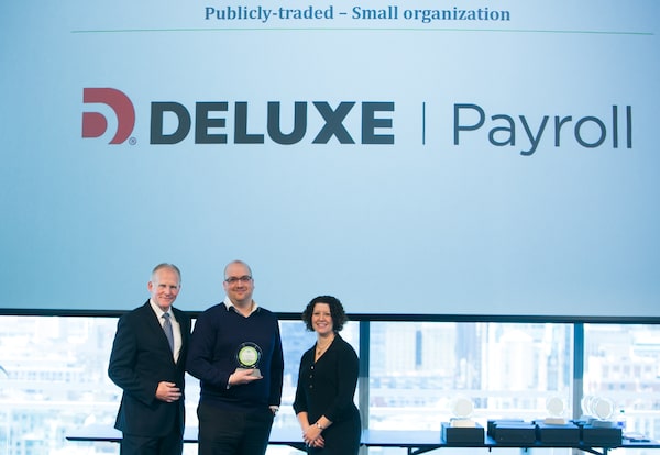 Deluxe Payroll winning its award, presented to Nicolas Drapeau Manager of Onboarding at Deluxe Payroll. The company was Top Category winner for top Publicly traded Small Organization. Being presented by Randal Phillips, Executive Vice-President and Chief Client Officer (far L) from Morneau Shepell and Gillian Livingston from The Globe and MailGlenn Lowson
