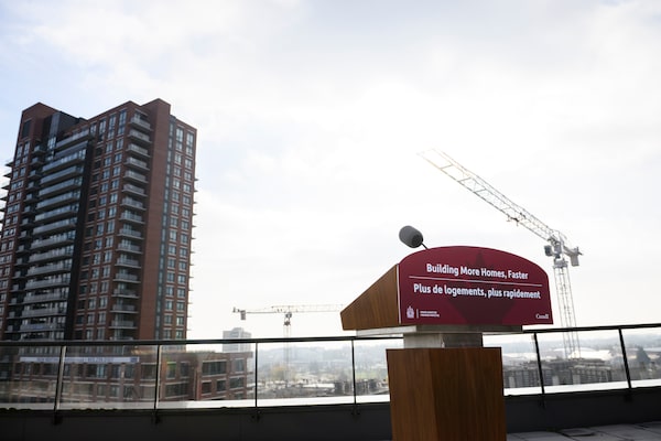 A podium is photographed ahead of a federal housing announcement, in Ajax, Ont., on Nov. 30.Christopher Katsarov/The Canadian Press