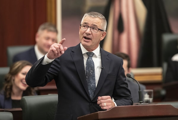 Alberta Finance Minister Travis Toews delivers the province's 2023 budget, in Edmonton on Feb. 28.JASON FRANSON/The Canadian Press
