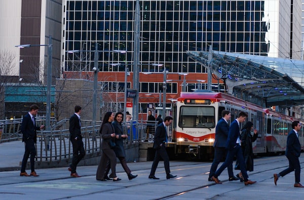 Business people cross the street in front of the 4th Street C-Train Station in Calgary on April 14, 2023.Jude Brocke/The Globe and Mail