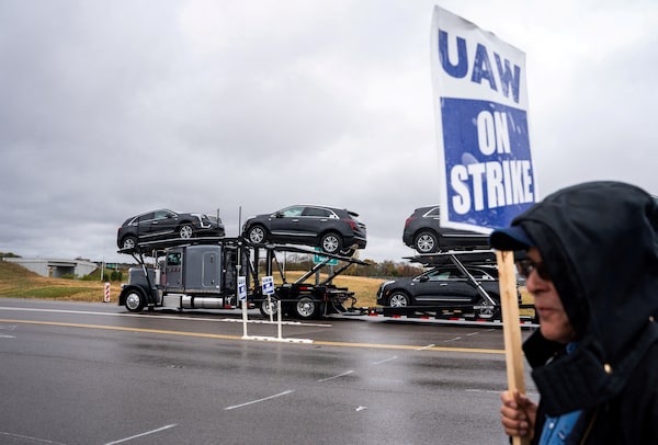 An independent contractor hauls vehicles made at the Spring Hill General Motors manufacturing plant as union members picket at the GM engine plant in Spring Hill, Tennessee, on Oct. 30.SETH HERALD/Reuters