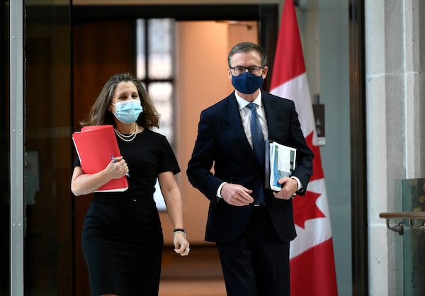Minister of Finance Chrystia Freeland, left, and Governor of the Bank of Canada Tiff Macklem arrives for a joint news conference in Ottawa, on Dec. 13, 2021.Justin Tang/The Canadian Press