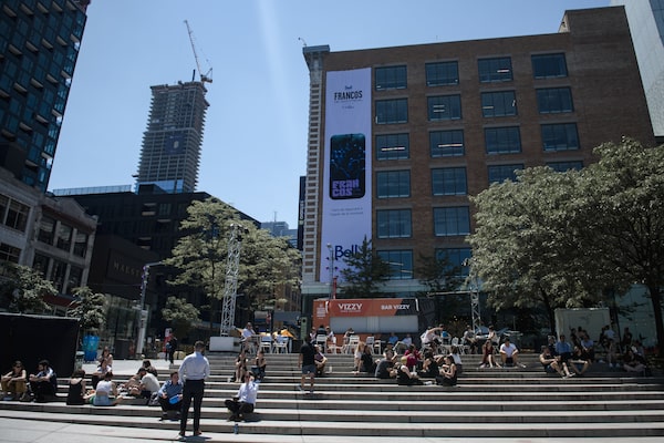 People sit in the Place des Festivals beneath a Bell Media billboard in in downtown Montreal on June 22.Andrej Ivanov/The Globe and Mail