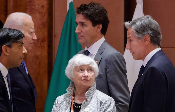 Britain's Prime Minister Rishi Sunak, left, US Treasury Secretary Janet Yellen, centre, US President Joe Biden, second from left, Canada's Prime Minister Justin Trudeau and US Secretary of State Antony Blinken, right, speak before the start of the second working session of the G20 Leaders' Summit at Bharat Mandapam in New Delhi on Sept. 9, 2023.LUDOVIC MARIN/AFP/Getty Images