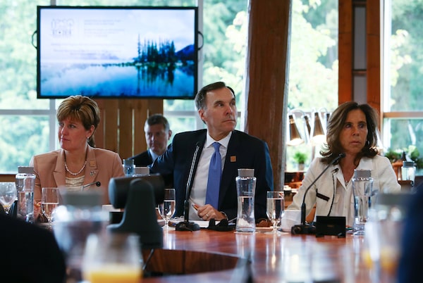 Minister of International Development Marie-Claude Bibeau, Minister of Finance Bill Morneau and French Ambassador to Canada Kareen Rispal listen during a meeting at the G-7 finance ministers summit in Whistler, B.C., on June 1, 2018. Ms. Rispal recently launched the France-Canada Innovation Platform to connect companies with academics and R&D experts in France and Canada.BEN NELMS/Reuters