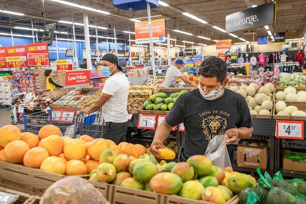 Daniel Hernandez Vargas, right, shops for groceries in Simcoe, Ont., on Sept. 4, 2020.Brett Gundlock/The New York Times News Service