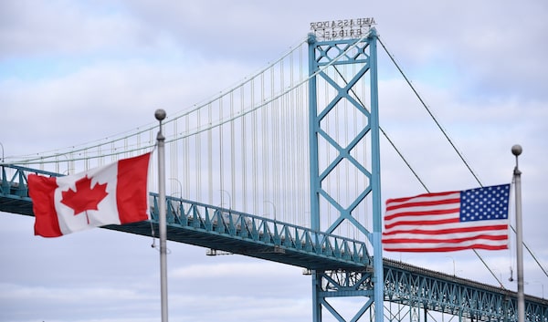 Canadian and American flags fly near the Ambassador Bridge at the Canada-U.S. border crossing in Windsor, Ont. on March 21, 2020.Rob Gurdebeke/The Canadian Press