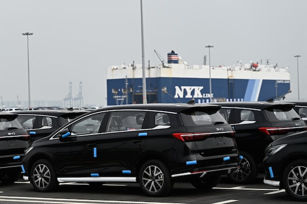 Vehicles by Chinese EV manufacturer BYD at the Port of Guangzhou, in China, on Feb. 22.PEDRO PARDO/AFP/Getty Images