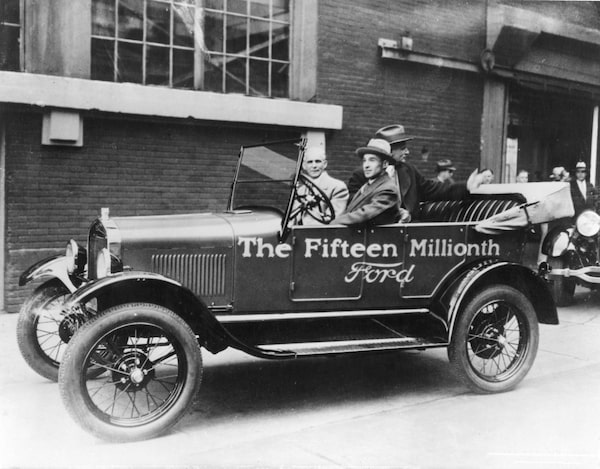 In 1927, Edsel Ford and his 64 year old father, Henry Ford and Charles Sorensen (backseat) drove the Fifteen Millionth Model T out of the Highland Park Plant in Michigan.