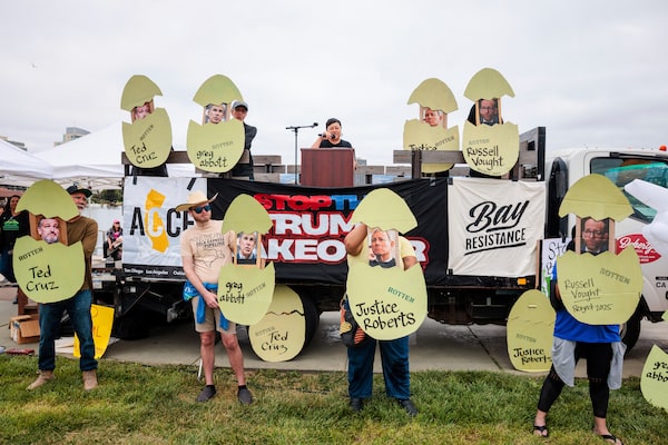 Organizers perform a skit about rotten eggs cracking to portray key Texas Republicans attempting to gerrymander the state at the Lake Merritt Amphitheater in Oakland, Calif., on Aug. 16.Richard H. Grant/The Associated Press