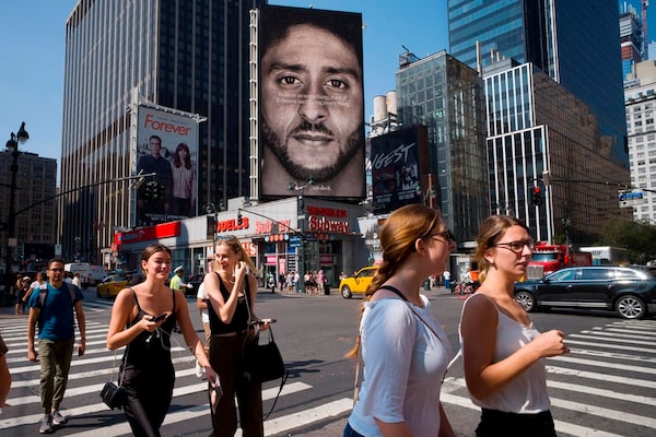 People walk by a Nike advertisement featuring Colin Kaepernick in New York on Sept. 6, 2018.Mark Lennihan/The Associated Press
