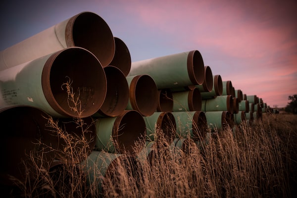 Miles of unused pipe, prepared for the proposed Keystone XL pipeline, sit in a lot on Oct. 14, 2014 outside Gascoyne, North Dakota.Andrew Burton/Getty Images